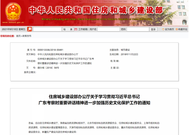 2018年底,住房和城鄉(xiāng)建設(shè)部印發(fā)《關(guān)于學(xué)習(xí)貫徹習(xí)近平總書記廣東考察時(shí)重要講話精神進(jìn)一步加強(qiáng)歷史文化保護(hù)工作的通知》(建辦城〔2018〕)56號(hào)。