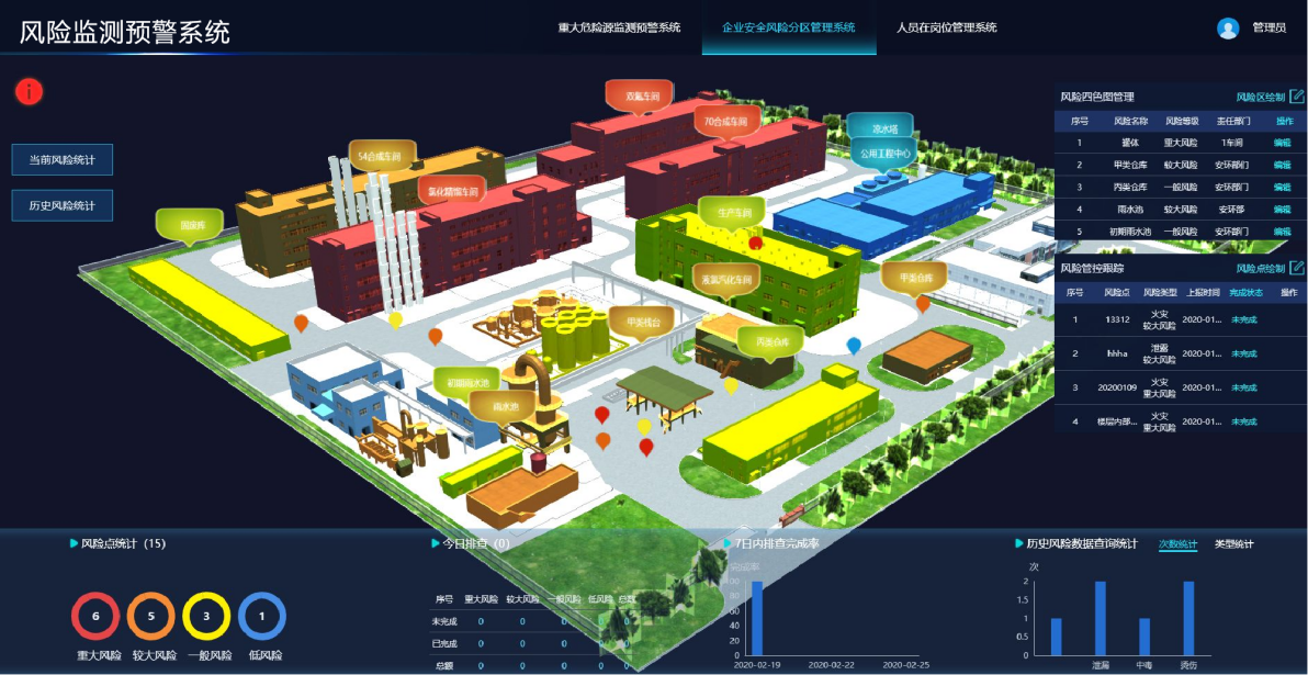 該園區三維可視化監管系統,運用傾斜攝影數據構建?;穲@區的實景三維地圖,利用通訊網絡接入實時感知數據,構建化工園區的數字孿生場景,以危險化學品安全生產“風險防控”為主線,建立涵蓋危險化學品生產、儲存、使用、經營、運輸、進口和危廢利用等全生命周期的?;钒踩O管和風險監測預警系統,形成從企業、園區、地方應急管理部門到應急管理部的分級管控與動態監測預警體系,有效化解重大安全風險、遏制重特大事故的發生。