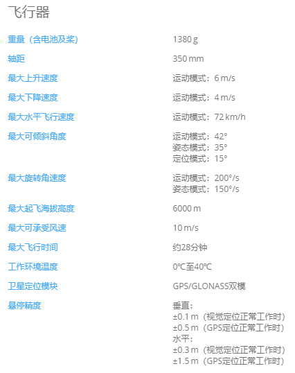 Phantom 4具有"障礙感知"、"智能跟隨"、"指點飛行"三大亮點,最長飛行時間約為28分鐘,高清圖像傳輸與控制距離遠達7公里。還具備由五目視覺、GPS/GLONASS雙模衛星定位系統、超聲波模組、傳感器冗余等組成的FlightAutonomy系統,能實現無GPS信號下的精準懸停,可感知前方障礙物。