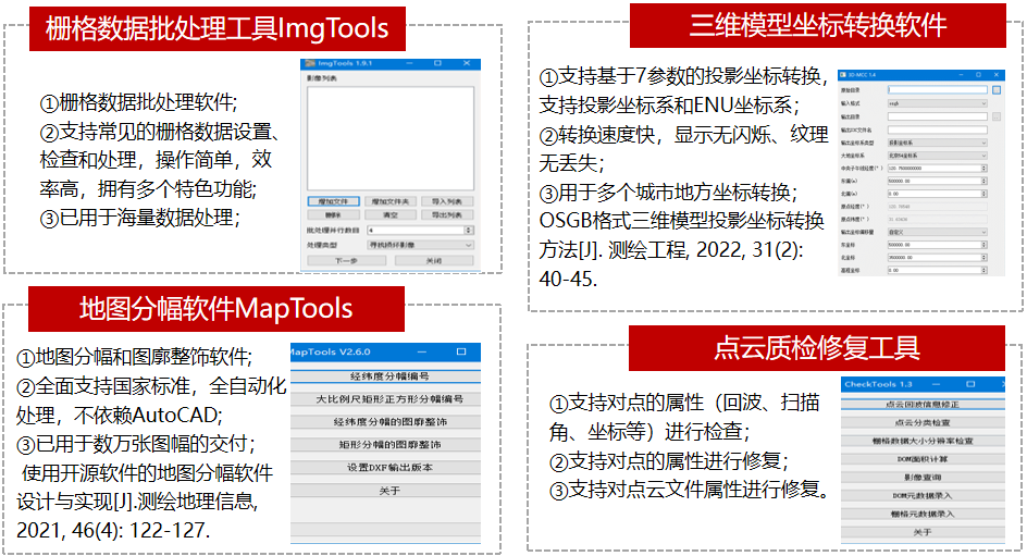 此外,還研發(fā)了掌握自主知識產(chǎn)權(quán)的地圖分幅軟件MapTools、三維模型坐標(biāo)轉(zhuǎn)換軟件、點(diǎn)云質(zhì)檢修復(fù)工具等內(nèi)業(yè)生產(chǎn)軟件。這些軟件進(jìn)行了大量理論和方法的創(chuàng)新,操作簡單方便,化繁為簡,實(shí)現(xiàn)了對海量點(diǎn)云、影像、三維模型等的批量化、自動(dòng)化處理,大大提高了內(nèi)業(yè)生產(chǎn)效率,支撐了眾多項(xiàng)目的進(jìn)度和交付。相關(guān)研究成果已發(fā)表在《遙感信息》、《測繪地理信息》、《測繪工程》、《地理信息世界》等中文學(xué)術(shù)核心期刊,獲得了多項(xiàng)國家發(fā)明專利、軟件著作權(quán)授權(quán)及一項(xiàng)軟件產(chǎn)品認(rèn)證。