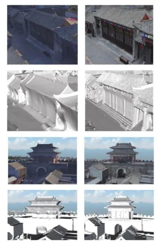 傳統傾斜攝影建模由于建筑物遮擋,采集不到房檐下數據、紋理覆蓋不夠或白模質量差。融合地面激光雷達掃描數據后,房檐下紋理清晰可辨,白模精度大幅提高,模型棱角分明。傳統傾斜攝影建模與多源數據融合建模效果對比如下: