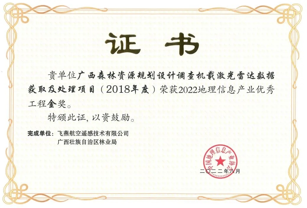 在廣西森林資源規劃設計調查項目中,飛燕遙感采集了10萬平方公里的激光點云數據,并將植被和地面點云分類,用于二類調查。是國內首次復雜地形條件下機載激光雷達的大規模林業應用,并獲得了中國地理信息產業協會優秀工程金獎。