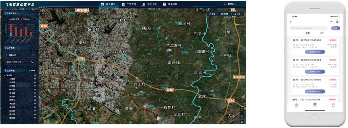 具備PC端和移動端,面向市級、區(qū)級、街鎮(zhèn)級三級執(zhí)法部門用戶,提供違法線索派單、處置、反饋等功能,形成線索工單處理閉環(huán)。