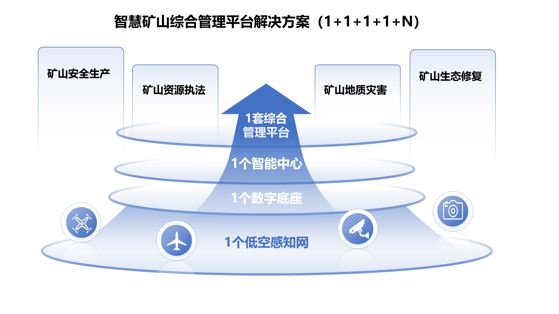 飛燕遙感深耕實景三維、人工智能建設多年,在礦山領域研發了飛燕智慧礦山綜合管理平臺。平臺按照“1+1+1+1+N”,即1個感知網、1個礦區數字底座、1個智能化與空間分析中心、1套礦山綜合管理平臺、N個礦山應用場景的建設思路,面向礦山安全生產、違法治理、礦產資源科學持續開采、生態修復等礦山業務,提供一體化解決方案。
