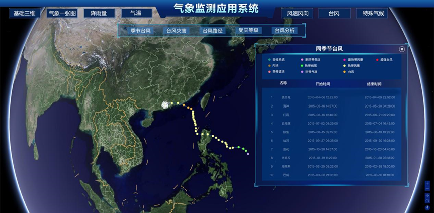 通過三維GIS技術,結合氣象數據、區域地形、河網等信息,構建氣象監測預警系統。基于氣象因素動態分析,科學預測區域內水域、水利受影響范圍及程度。針對極端天氣,例如臺風,系統會錄入臺風的運動軌跡與時間信息,預測臺風登陸的時間地點,適時發出預警信息。